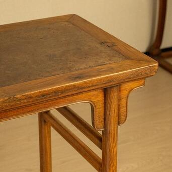 此件酒桌主体选用珍稀黄花梨木为材,色泽古拙莹亮,纹理清新淡雅,观之顿感悠悠古韵。桌面攒框镶瘿木板,瘿木瑰丽诡谲的花纹满布,色若琥珀,金黄璀璨,有如水波流转、云海翻涌。文人雅士尤其喜爱癭木的病态美,审美格调颇高。面板宽厚,边抹经典的冰盘沿,上舒下敛,至底压一边线。面板与腿足以夹头榫相连,两侧嵌装光素刀牙板。侧面腿足间装双横枨,既可加固结构,又丰富侧面观感。腿足圆材直落,侧脚收分,挺拔高挑,更显整器沉稳。