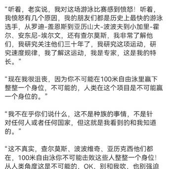 潘展乐赢得100米自由泳决赛,并且打破世界记录之后,澳大利亚的游泳教练布雷克.霍克已经破防了,他甚至说“这是人类无法做到的事情”,所以“一定是假的”。