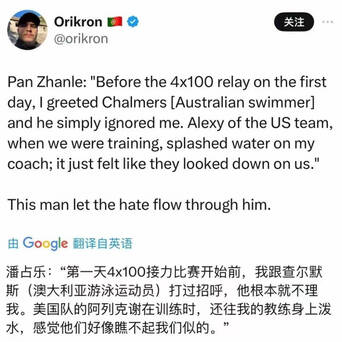 潘展乐的性格也非常好,赢了比赛之后,并没有“松弛”,而是得理不饶人,狠狠嘲讽了美国队那些没有素质的white trash。