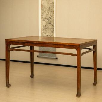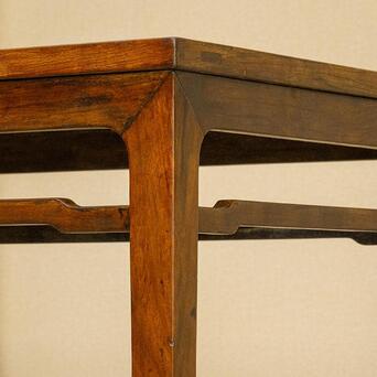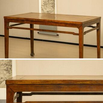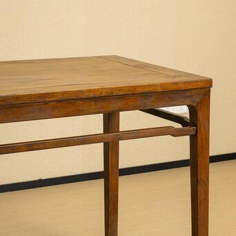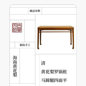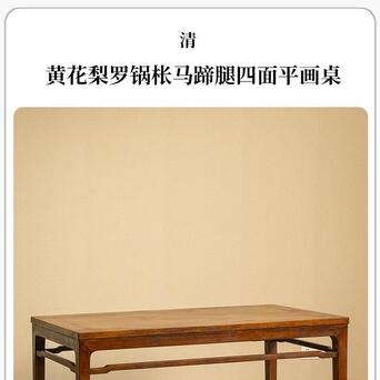 本品为结构与线脚均极为简练的四面平画桌,质朴简练、平淡耐看。以黄花梨为材,木色莹亮,木质坚实,包浆温润,触感舒适。桌面攒框装板,以黄花梨流金渗水的天然纹理取胜,观之如云似霞,细密的麦穗纹清晰可辨。牙板与腿足以榫卯结构紧密连接,腿间设罗锅枨,是极为重要的稳固结构,线条弧度挺拔秀丽。四腿方材,至足端作内翻马蹄,俊秀有力。侧脚收分明显,从而拥有更为匀称和谐的视觉效果,是明式家具结构设计的精妙之处。