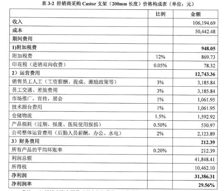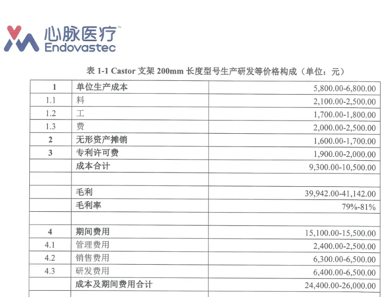 其中,Castor支架单位生产成本是5800元—6800元,加上无形资产摊销和专利许可费用,其成本为9300元—1.05万元。同时,包括管理、销售、研发三大项在内的期间费用为1.51万元—1.55万元。由此,产品的成本及期间费用合计为2.44万元—2.6万元,加税后的费用则为2.89万元—3.02万元。