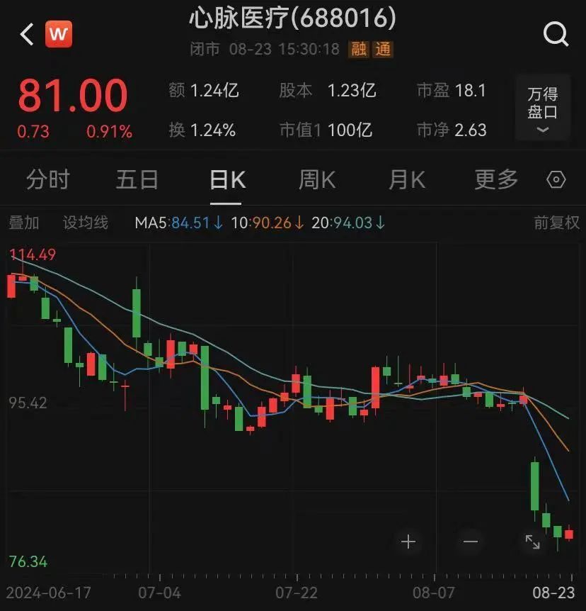 股市表现上,心脉医疗自8月20日以来股价一路下探,截至8月23日收盘,心脉医疗报81元/股,股价累计下跌16.22%,目前市值为100亿元。