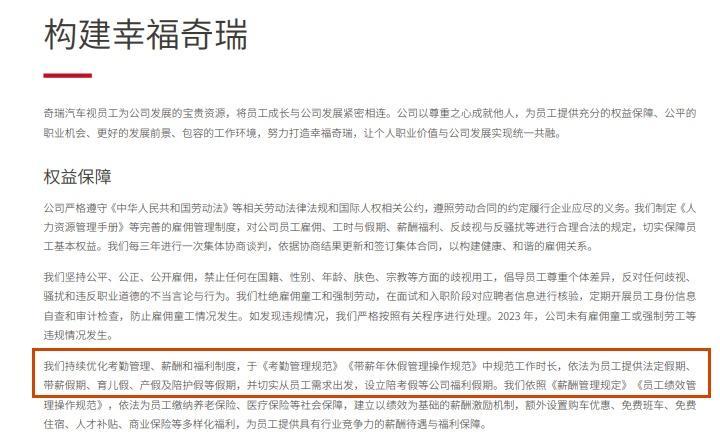 其中,在其54页“构建幸福奇瑞”一章的“权益保障”里面,提及:“持续优化考勤管理、薪酬和福利制度,于《考勤管理规范》《带薪年休假管理操作规范》中规范工作时长,依法为员工提供法定假期、带薪假期、育儿假、产假及陪护假等假期,并切实从员工需求出发,设立陪考假等公司福利假期。”而正是这段内容,引来了争议。