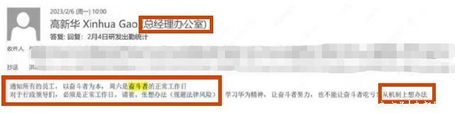 次日,高新华回应媒体称,邮件要求对象不是普通员工,是激发愿意努力工作的员工,鼓励他们奋斗,同时不让他们吃亏,本意不是压榨员工,但是当被问及“规避法律风险”时,他表示正在开会,不方便和记者交流。